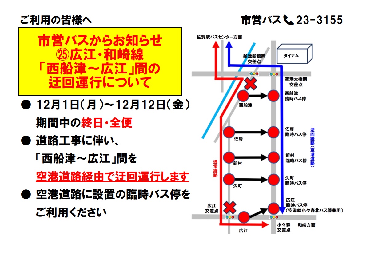 【12/1(月)~12/12(金)】 25広江線 道路工事に伴う「西船津~広江」間の迂回運行について