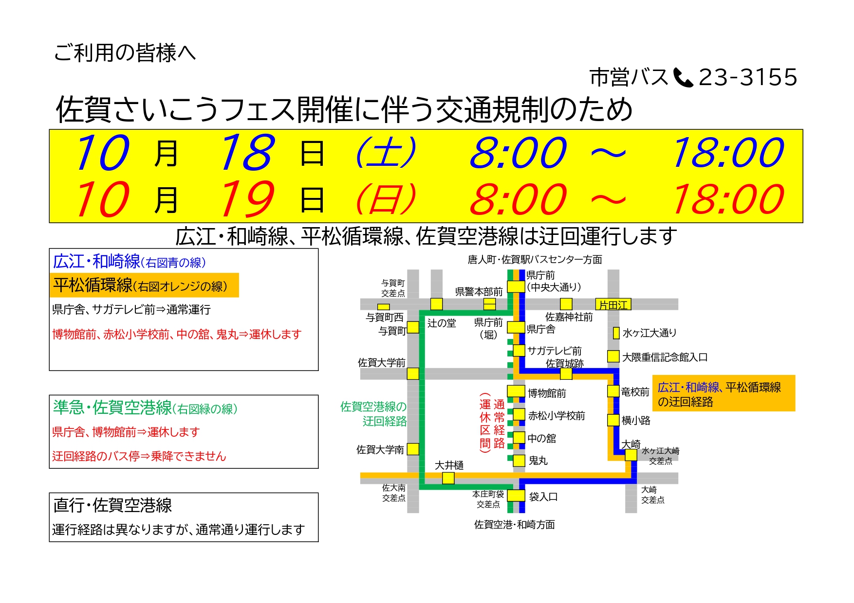 【10月18日(土)~19日(日)】『佐賀さいこう!フェス』に伴う迂回運行のお知らせ⇒PDF版はこちら